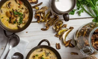 - Սնկերի վրա 15-20 րոպե լցնել եռացրած ջուր։ Սոխը 4 րոպե տապակել ձեթի մեջ, ավելացնել սունկը, լցնել կրեմի մեջ, աղ և պղպեղ։ Եփել 5-7 րոպե։